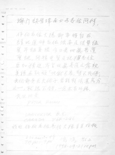 馮馮前輩來函手稿