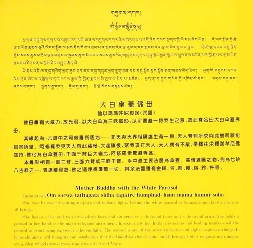 在佛教历史上,不乏大白伞盖佛母之灵验案例。有些行者在遇到大火灾时,一诵咒便令大火熄灭。有些人在遇到河水泛滥祸害时,用此法门令河断流。