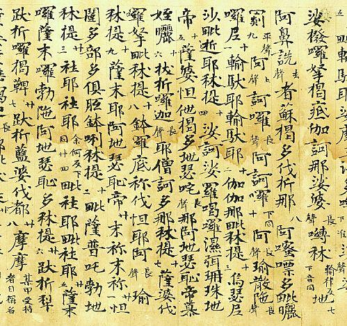 當時帝釋聽到以上的開示,便立即向佛陀祈請說:“世尊啊,為了您的大慈,請為眾生演說這個延年益壽之道吧!”佛陀知道帝釋的意思,心想,帝釋一定很喜歡聽我說這個佛頂尊勝陀羅尼法,於是佛陀便立即宣說佛頂尊勝陀羅尼咒: