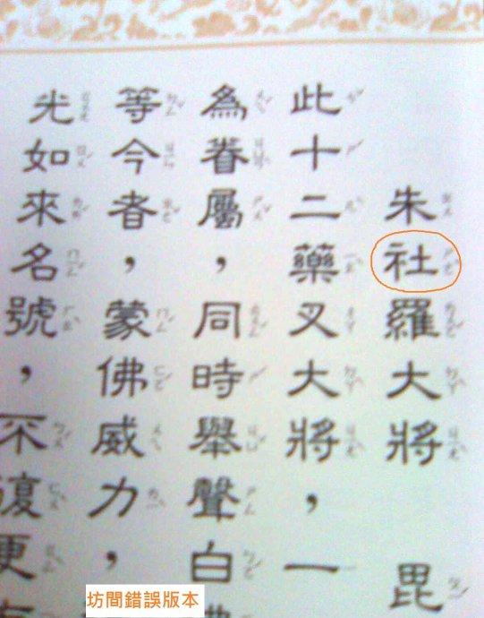 坊間流通眾多的《藥師經》版本當中,有很多將十二神將其一的「招杜羅」神將,字體誤植為「招社羅」;之後再翻印經書的人亦不加細校,照版影印,以致一錯再錯。