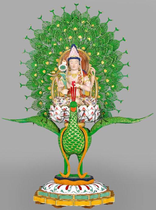 孔雀明王,與不動明王一樣,同是大日如來之特使,現佛母身,發大慈悲願,要救盡一切眾生遠離所有魔障而同歸正道。