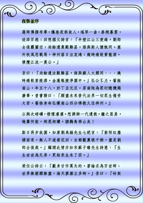 吾曰:「尚餘遺法艱難甚,誰與癡人大願同...幾時痛飲菩提酒,金蓮報捷淨園中。」弘公孓力,誓振南山,年五十八,於丁丑元旦,居南阤為眾衍隨機羯磨畢,曾書聯曰:「願盡未來普代法界一切眾生備受大苦,誓捨身命弘護南山四分律教久住神州。」