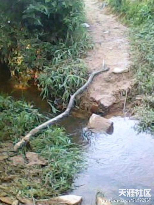 小河,目前是枯水期就靠这一根木条过河,很难跳过河的。