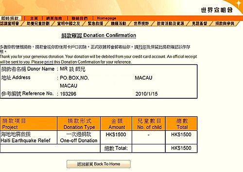 我可盡量用信用卡代大家捐款,你只要在此文下留言捐款數目,在1月19日(下星期二)滙總捐款數目後,就會用「善心蓮心」名義捐給香港世界展望會(宣明會)。之後大家亦無需還款給我,只要將同等的捐款數目用來作放生、印經或其他任何公益善行都可以,這樣款項就對銷了。