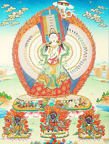 我們那時候做首楞嚴咒牌和大白傘蓋佛母咒就是做的這個。這個咒牌裏面有很多咒文,就不只大白傘蓋佛母咒,但這後面就用大白傘蓋佛母咒代表擁護和降魔,你念動這個大白傘蓋佛母忿怒金剛遣魔咒的時候,佛母就會變成這個本相。你看有多少手,多少層頭,還有火的。變成一個降魔的相,而且拿著一把傘,代表祂的法器就是這把傘,顧名思義叫大白傘蓋佛母,代表祂的就是這個唵“om ”字。