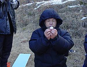 2002年1月1日的上午10時,在韓國羅州的聖母聖山上,朱利亞和一群朝聖者對著耶穌十字架聖像祈禱.當朱利亞用雙手觸摸十字架上耶穌聖像的雙腳時,從耶穌聖像右腳的中指上形成一滴寶血,正欲流出來.朱利亞見到此情況便“呀”一聲驚叫起來!當她把頭部再從耶穌聖像腳下方往上觀察清楚時,那滴寶血竟然滴下並落入她口中,立即變化成聖體;這使朱利亞感到驚奇並再次尖叫起來.